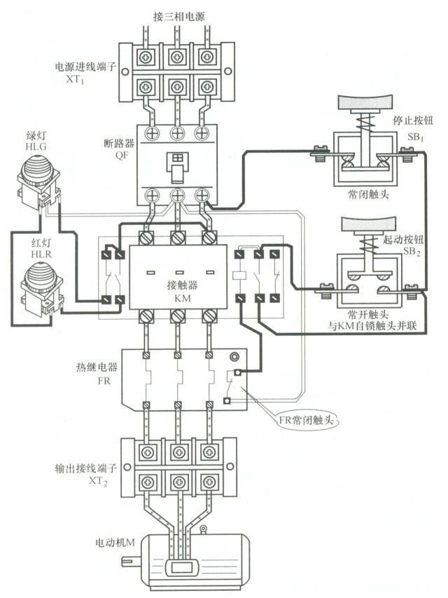 主電路路徑為:電源L1、L2、L3→端子板XT1→斷路器QF→接觸器KM主觸頭→熱繼電器FR→端子板XT2→電動(dòng)機(jī)。