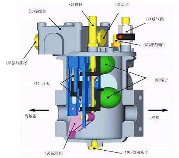 氣體繼電器是一種非常靈敏的變壓器內(nèi)部故障保護(hù)裝置,它安裝在變壓器的器身與油枕之間,主要保護(hù)范圍是變壓器內(nèi)部的相間短路、層間或匝間短路、油面下降以及分接開關(guān)接觸不良等故障。