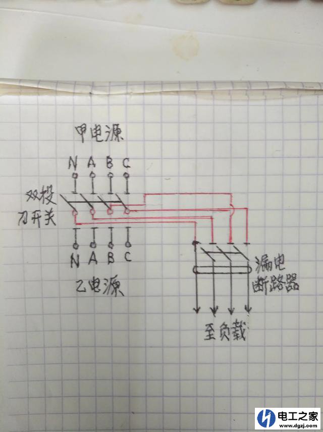 雙投刀開關(guān)中間位置的四個接線點(diǎn)、分別連接接至三極四線漏電斷路器的四個接線點(diǎn)。其具體連接如下圖;