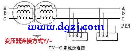 一般在低壓配電線路中都采用的是四根導(dǎo)線進(jìn)行傳輸?shù)?。在高?0KV降到低壓380V的過程中所用的變壓器,它的一次繞組的連接形式是三角形的連接方式,變壓器的二次繞組所采用的連接方式是星形連接方式,如下面的示意圖所示。這樣以來從變壓器中性點(diǎn)引出的導(dǎo)線我們叫它工作零線,從變壓器次級(jí)繞組上引出的線叫火線。