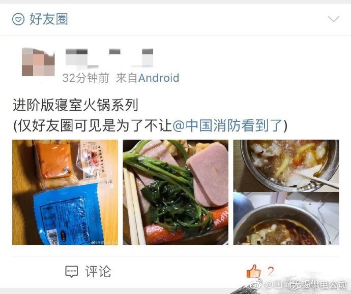 【在宿舍吃火鍋,想曬圖又怕被發(fā)現(xiàn),于是……】宿舍火鍋愛(ài)好者,為吃頓火鍋,也是煞費(fèi)苦心!準(zhǔn)備齊全后拍個(gè)照,發(fā)微博前先設(shè)個(gè)“僅好友圈可見(jiàn)”。喲喲喲,不被發(fā)現(xiàn)就是“安全”了?你的“圖一時(shí)之快”,可能換來(lái)的是一個(gè)宿舍,甚至一棟宿舍樓的“不安全”!引來(lái)電火得不償失。