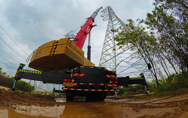 A42號(hào)鐵塔高85米,重116噸,停電后才能組立。為提高功效,項(xiàng)目部調(diào)用200噸吊車組立?,F(xiàn)場(chǎng)泥濘濕陷,吊車進(jìn)不去,項(xiàng)目部又用水泵抽水,用60多塊鋼板鋪路,給吊車創(chuàng)造條件。
