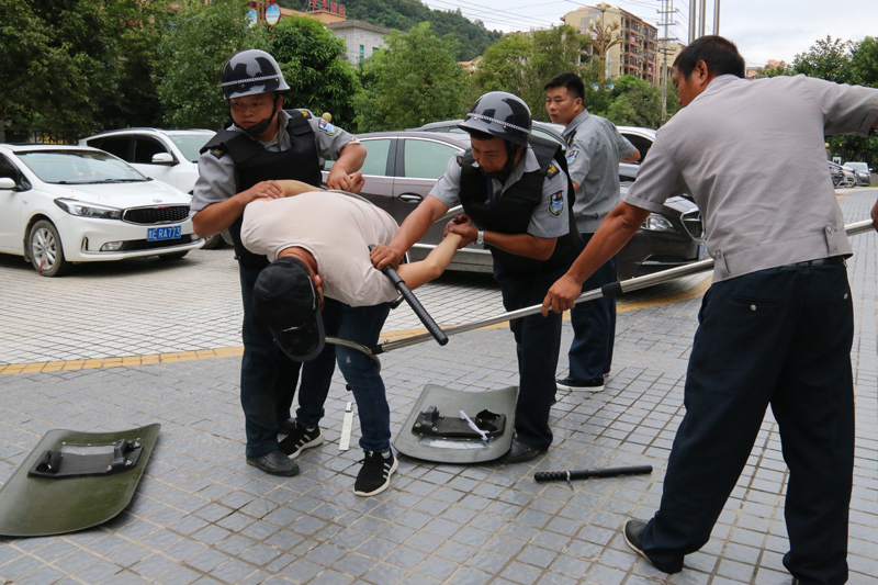 9月18日上午11時許,“突發(fā)性恐怖襲擊”演練正式開始。按照預(yù)設(shè)情景,三名來勢洶洶的“歹徒”手持刀具、燃燒瓶,強(qiáng)行沖進(jìn)生產(chǎn)調(diào)度綜合樓準(zhǔn)備實(shí)施破壞,襲擊保安和工作人員。大樓保安人員快速反應(yīng),迅速啟動應(yīng)急預(yù)案,應(yīng)急分隊(duì)成員手持警棍、鋼叉與暴恐分子周旋、搏斗,尋找適當(dāng)機(jī)會制服暴恐分子。最終通過團(tuán)隊(duì)協(xié)作成功將“歹徒”制服。