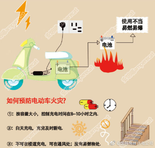 【預(yù)防電動車火災(zāi) 正確充電是關(guān)鍵】近年來,全國各地頻繁發(fā)生電動車起火事故,造成財產(chǎn)損失和人員傷亡。如何預(yù)防電動車火災(zāi),按照電瓶容量大小的不同,一般在8-10小時內(nèi)就能充滿;盡量在白天充電,充電后一定要及時斷電;別在樓道內(nèi)充電,充電時請通風(fēng),最佳環(huán)境溫度是25℃。