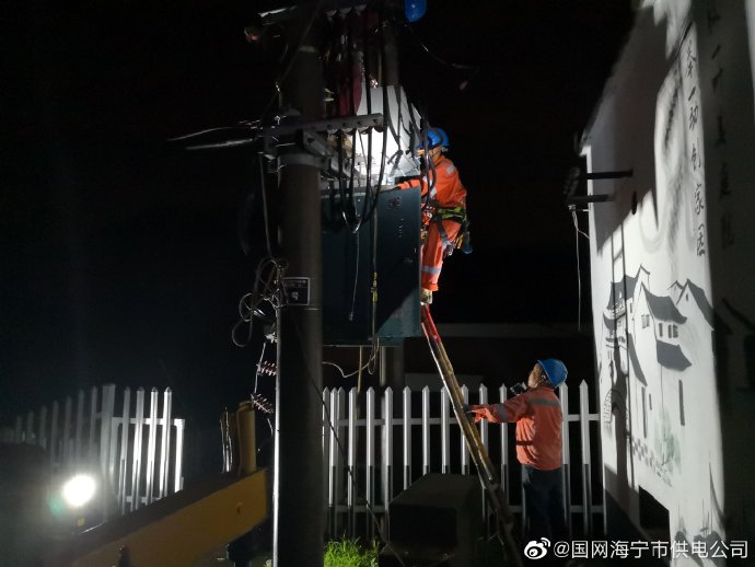 6月27日深夜10點(diǎn)多,在海寧市鹽官鎮(zhèn)萬(wàn)壽村陳家木橋,3盞應(yīng)急燈光束的匯聚下,國(guó)網(wǎng)海寧市供電公司鹽官供電所的搶修隊(duì)員還在緊張地進(jìn)行變壓器固定和接線(xiàn)工作。夜深了,本來(lái)里三層外三層前來(lái)督戰(zhàn)的村民在得到“今夜可以通上電”的滿(mǎn)意答復(fù)后已陸續(xù)散去。