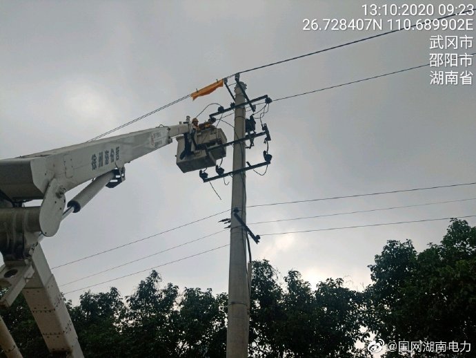 10月13日,國網(wǎng)武岡市供電公司帶電作業(yè)班組成員對10千伏法高線安電支線12號桿進(jìn)行帶電解開支線三相引線作業(yè)。(朱蘊(yùn)喆)