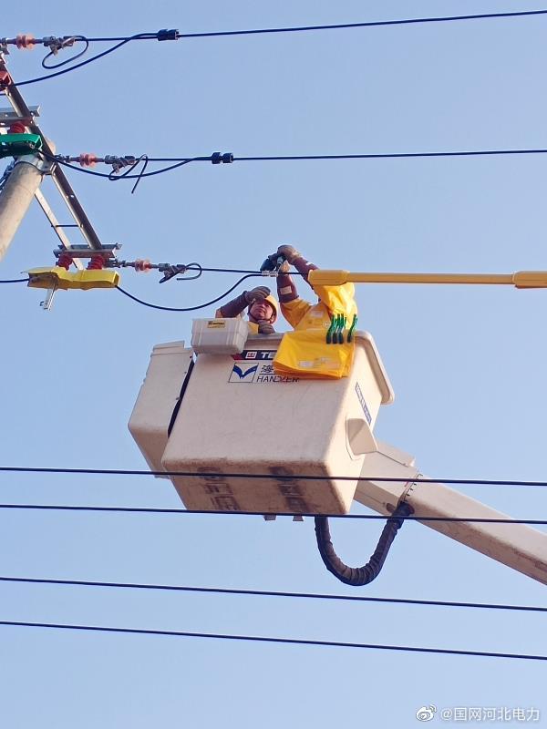護航“煤改電”,保暖保供不停電。12月22日,國網新樂市供電公司帶電作業(yè)班對10千伏592西田線西田村內分支07號桿進行帶電綁扎絕緣子,有效提高線路供電可靠性,為迎峰度冬期間電網安全穩(wěn)定運行奠定基礎。(劉志勇 谷賽特) ????