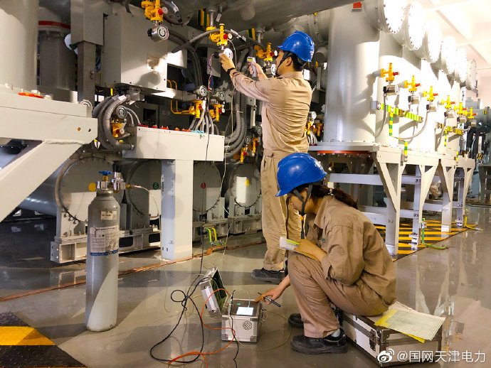 6月13日,天津送變電員工王德新、范明怡在交流220千伏學(xué)府路變電站220千伏設(shè)備區(qū)校驗SF6密度繼電器 ????.