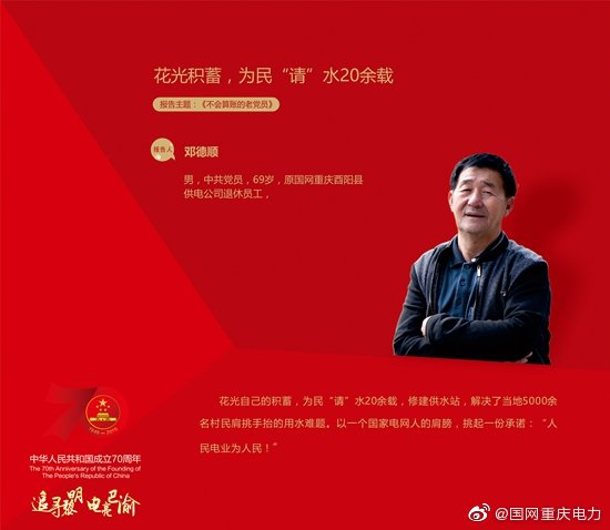 36年前,鄧德順成為酉陽縣供電公司的一名駕駛員,勤勞能干,業(yè)余時間去打鐵、理發(fā)、跑運輸,很快就攢下一筆存款,如果故事就這樣發(fā)展下去,鄧德順現(xiàn)在的生活會是富足又安逸的。但在1997年春節(jié),一塊兒長大的村民石邦祿挑水摔折了腿,讓鄧德順惦記起還吃不起自來水的鄉(xiāng)親們,他認(rèn)識到如果說自己這些年都是在被別人幫助,在積蓄能量,那這時也到了自己發(fā)光發(fā)熱,去幫助別人的時候了。說干就干,鄧德順立馬就張羅著買管道修水站,下定決心要解決家鄉(xiāng)吃水難問題。這一干,就是二十多年,鄧德順投進去了400萬,光是管道就換了三次,從小管到大管,從易腐蝕的鐵管到夠堅固的膠管……從小有積蓄到賣掉房子還欠下外債,這筆賬鄧德順都不想算。如今,水站運作上了軌道, 4000多人的吃水問題解決了。老黨員鄧德順還是不算賬。水費按戶收,一年只收120,孤寡老人、貧困戶、退伍軍人家庭水費全免,而每年光維修維護費用就得一萬多, 所以2010年退休后鄧德順就干脆搬回村里來自己搞維護。鄧德順總覺得,這就是自己作為一個老黨員責(zé)無旁貸的使命,覺得這件事就應(yīng)該由自己擔(dān)當(dāng)起來。如今,他還在盤算著招商引資讓家鄉(xiāng)甘甜的純凈水成為產(chǎn)品,走出高莊村,給村民們帶來更多的就業(yè)機會和經(jīng)濟收入。從自發(fā)到自覺,從受助到助人,從蓄電到發(fā)電,談起這些年的付出,鄧德順的話很樸實:這就是一個共產(chǎn)黨員應(yīng)該做的。