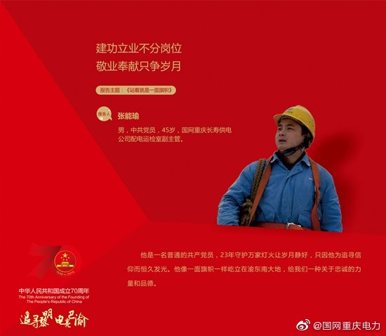張能瑜,中共黨員,全國勞模,國網(wǎng)長壽供電公司配電運(yùn)檢室副主管。1996年他從一個(gè)對電好奇的青年變成了一名護(hù)電的線路檢修工人,每天的工作就是和水泥桿、鐵塔、導(dǎo)線打交道。在任武隆巡線站站長時(shí),為了盡快摸清路線,掌握第一手資料,他徒步從涪陵至武隆、彭水一帶沿線進(jìn)發(fā),有溝跨溝,無路開山,把自己一個(gè)人當(dāng)成了一支隊(duì)伍。45天之后,磨破三雙膠鞋,終于走完290公里,巡視完587座鐵塔,成為公司第一個(gè),也是唯一一個(gè)掌握了渝東南220千伏線路走向的人。這股認(rèn)真的精神貫穿了他的職業(yè)生涯,從業(yè)23年來他先后獲得了全國勞動(dòng)模范、全國五一勞動(dòng)獎(jiǎng)?wù)?、國家電網(wǎng)公司勞動(dòng)模范、感動(dòng)重慶十大人物,國家電網(wǎng)十大杰出青年等等近百項(xiàng)榮譽(yù),公司成立了以他名字命名的勞模創(chuàng)新工作室,還組建了安全隱患排查隊(duì),他成為帶頭人。盡管工作環(huán)境和性質(zhì)都發(fā)生了改變,但十多年的巡線留給他的習(xí)慣依然未變,周末或節(jié)假日,他依然像巡線一樣,走鐵塔,看線路,一走就是兩萬多步。大家經(jīng)常開玩笑說:“張勞模,你是在刷步數(shù)嗎?又占據(jù)了朋友圈的封面!”其實(shí),他不是想要占據(jù)朋友圈封面,他就是想以黨員的身份舉起一面旗幟,帶領(lǐng)大家奔向更光亮的生活!