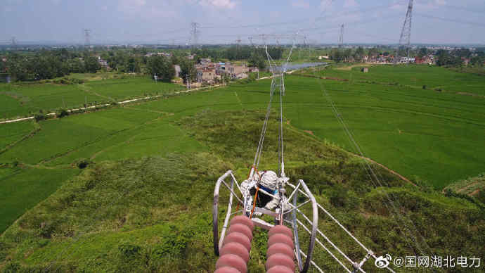 【線下綠意盎然,線上熱火朝天】7月19日,盛夏烈日當(dāng)頭,國網(wǎng)湖北檢修公司輸電檢修中心職工正熱火朝天地開展帶電作業(yè),處理導(dǎo)線引流板發(fā)熱問題,確保主網(wǎng)穩(wěn)定供電。