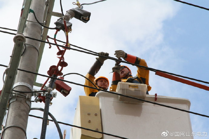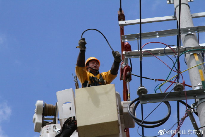 【高溫天帶電接火??百姓用上清涼電】7月28日,經(jīng)過一個半小時的高空忙碌,國網(wǎng)費縣供電公司作業(yè)人員順利將費縣上冶鎮(zhèn)埠后村民委員會250千伏安配電變壓器帶電接入10千伏上冶五線埠后村委會支線11號桿,回到地面的工作人員仿佛剛剛做了一場“高空桑拿”,頭頂?shù)暮顾樦弊油碌温?,脫下絕緣服,里面的藍色工裝水洗一般濕透。