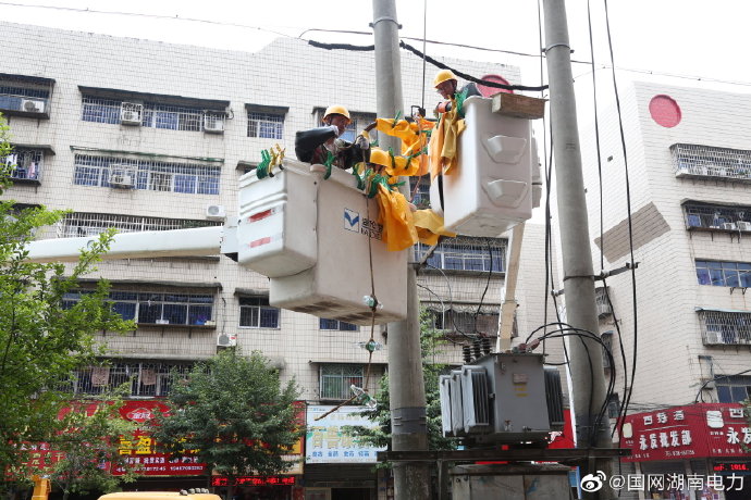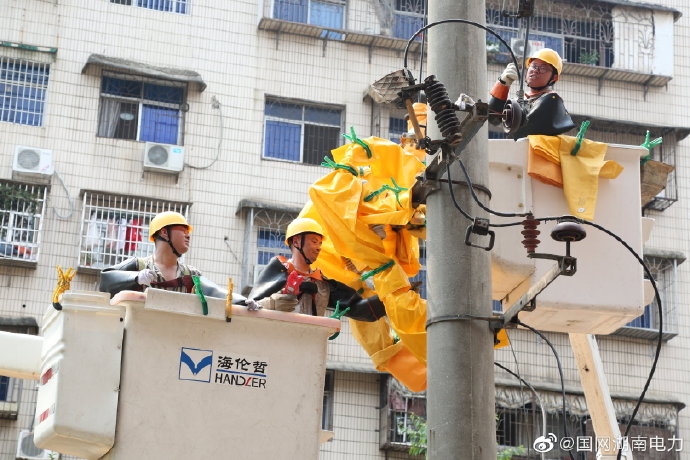 昨日上午11時許,婁星區(qū)供電支公司帶電作業(yè)工作人員正頂著烈日,穿著厚厚的絕緣服在婁底老街10千伏九沿線#095桿上帶負荷更換跌落保險,客戶用電沒有受到任何影響,受到了周邊商戶的一致好評。