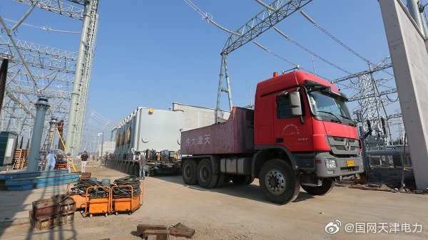 國網(wǎng)天津建設(shè)公司:天津渠陽(寶北)500kV變電站工程首臺三相一體500千伏主變壓器順利上臺就位