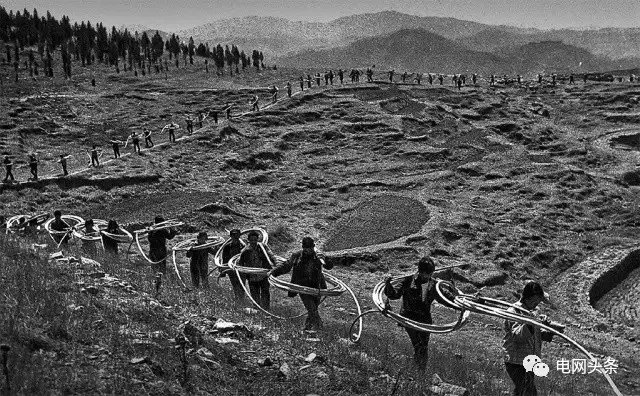 ?上世紀(jì)八十年代,我國山區(qū)電力施工架線,一根核桃粗細(xì)的輸電導(dǎo)線,需要幾十人乃至上百人用扁擔(dān)挑著上山進行施工放線。圖為1982年山東省淄博市博山區(qū)石門鄉(xiāng)龍?zhí)蒙絽^(qū)架線現(xiàn)場。