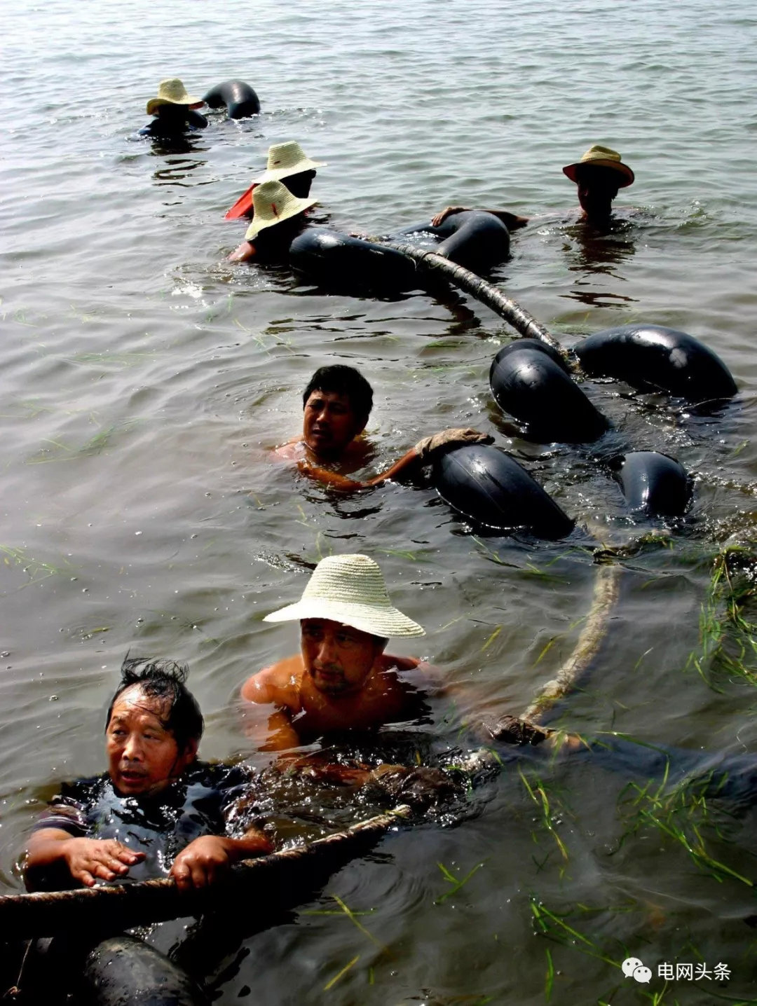 ?湖北“戶戶通電”工程現(xiàn)場,供電員工泡在水中敷設(shè)深水電纜。