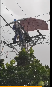 8月12日,國網(wǎng)廣安供電公司華鎣供電分公司中和供電所員工們在10KV中臨線羊頭壩村5號臺區(qū)2號桿“電桿上撐傘改負荷”,確??蛻舴€(wěn)定可靠用電無憂。