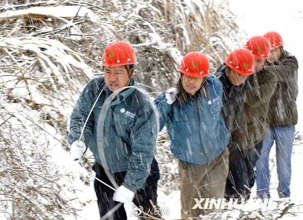 2008年1月28日,國(guó)網(wǎng)安徽省電力有限公司宣城供電公司水東供電所員工冒著大雪搶修線路。 李曉紅攝(新華社發(fā))