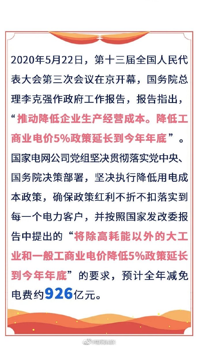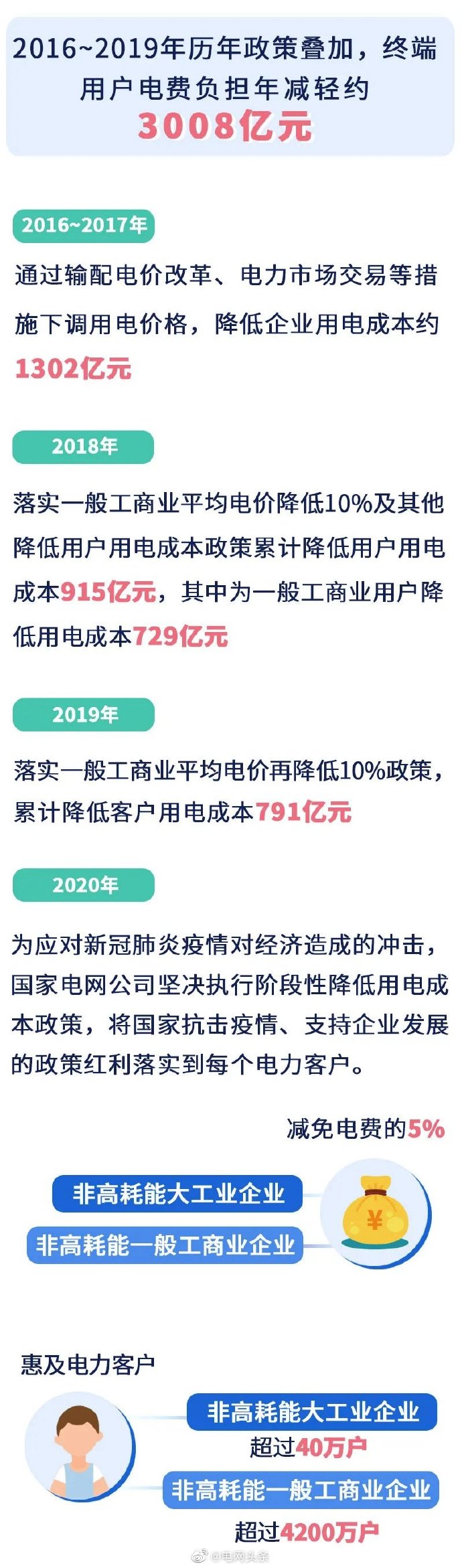 2016~2019年歷年政策疊加,國家電網(wǎng)經(jīng)營區(qū)終端用戶電費(fèi)負(fù)擔(dān)年減輕約3008億元。2020年,為應(yīng)對新冠肺炎疫情對經(jīng)濟(jì)造成的沖擊,國家電網(wǎng)公司堅決執(zhí)行階段性降低用電成本政策,預(yù)計全年減免電費(fèi)約926億元。 ????