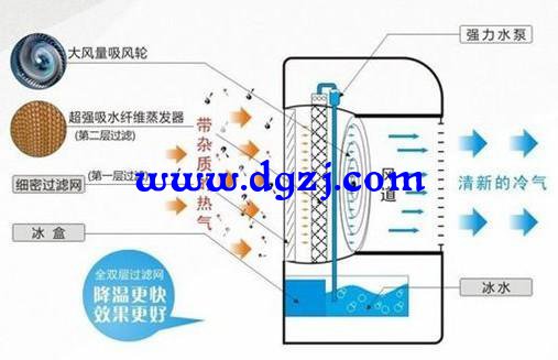 其實(shí),這就是“空調(diào)扇”的原理,既然作為一種商品推出,不能太土氣,制作的就要有點(diǎn)檔次,下圖就是“空調(diào)扇”的結(jié)構(gòu)示意圖,下部水槽裝水,水被冰盒中的冰晶冷卻,水泵將冷卻后的水抽到高處沿蒸發(fā)器流下,水蒸發(fā)吸熱,使空氣溫度降低,再被風(fēng)輪吹出。