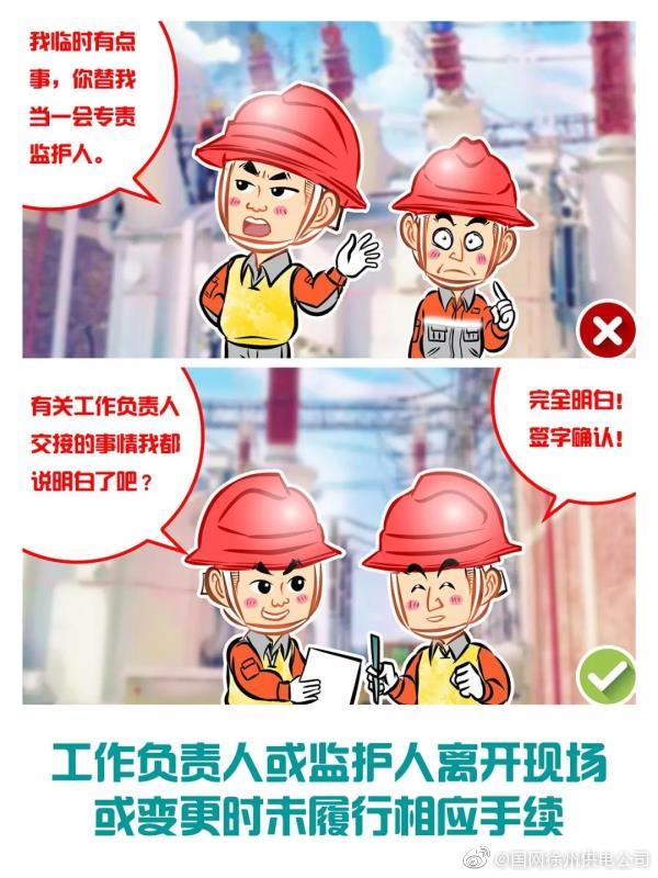 【電力施工安全反違章——工作負(fù)責(zé)人、專責(zé)監(jiān)護(hù)人離開工作現(xiàn)場或變更時未履行相應(yīng)手續(xù)】專責(zé)監(jiān)護(hù)人需長時間離開工作現(xiàn)場時,應(yīng)由工作負(fù)責(zé)人變更專責(zé)監(jiān)護(hù)人,履行變更手續(xù),并告知全體被監(jiān)護(hù)人員。工作期間,工作負(fù)責(zé)人若需暫時離開工作現(xiàn)場,應(yīng)指定能勝任的人員臨時代替,離開前應(yīng)將工作現(xiàn)場交待清楚,并告知全體工作班成員。原工作負(fù)責(zé)人返回工作現(xiàn)場時,也應(yīng)履行同樣的交接手續(xù)。工作負(fù)責(zé)人若需長時間離開工作現(xiàn)場時,應(yīng)由原工作票簽發(fā)人變更工作負(fù)責(zé)人,履行變更手續(xù),并告知全體工作班成員及所有工作許可人。原、現(xiàn)工作負(fù)責(zé)人應(yīng)履行必要的交接手續(xù),并在工作票上簽名確認(rèn)。