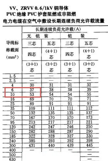 從圖片中可以看到圓圈①處可以使用10平方的PVC銅線,而②③④⑤⑥我都放置的6平方的PVC銅線,其實⑥處的電線可以更小一點,但是很少就沒有必要了,就保持一致了!—這個電纜規(guī)劃的依據(jù)還是運行在三角形環(huán)內(nèi)的電流比主電流小,環(huán)內(nèi)電流25A,主電流43.2A。 那么就來看看10平方和6平方的PVC電線所能承受的電流吧。