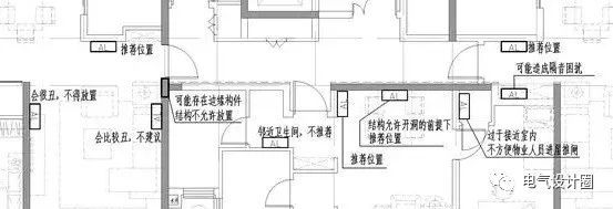 (5)一進(jìn)門(mén)的玄關(guān)處,是個(gè)不錯(cuò)的位置,但要考慮玄關(guān)柜與配電箱是否存在打架的問(wèn)題,配電箱給卡到柜子的一半是很難受也沒(méi)法用的,考慮到弱電箱可能在配電箱的下方,而鞋柜里面也有大量的隔板,這雖然是后期精裝需要注意的問(wèn)題,但施工圖階段盡量也做出考慮。