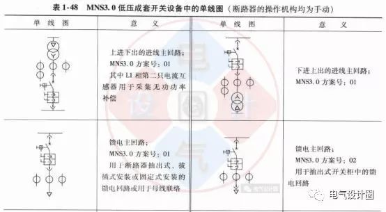 單線圖標(biāo)識(shí)往往與低壓成套開(kāi)關(guān)設(shè)備的一-次方案有關(guān)。表1-48中的單線圖對(duì)應(yīng)的方案配置描述可查閱本書(shū)后續(xù)相關(guān)內(nèi)容。