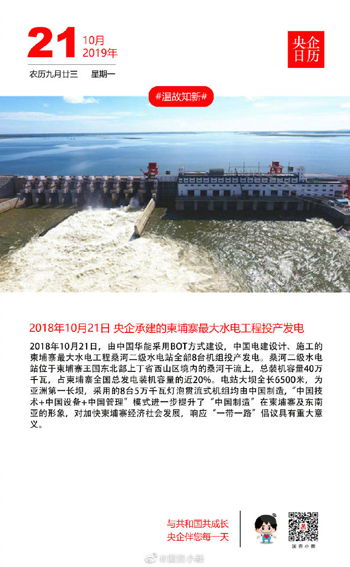【去年今日,央企承建的柬埔寨最大水電工程投產(chǎn)發(fā)電】2018年10月21日,由中國(guó)華能采用BOT方式建設(shè),中國(guó)電建設(shè)計(jì)、施工的柬埔寨最大水電工程桑河二級(jí)水電站全部8臺(tái)機(jī)組投產(chǎn)發(fā)電。桑河二級(jí)水電站位于柬埔寨王國(guó)東北部上丁省西山區(qū)境內(nèi)的桑河干流上,總裝機(jī)容量40萬(wàn)千瓦,占柬埔寨全國(guó)總發(fā)電裝機(jī)容量的近20%。