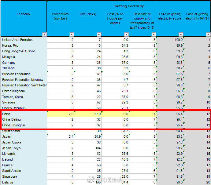 中國目前在“獲得電力”方面全球排名第12 比去年上升2位