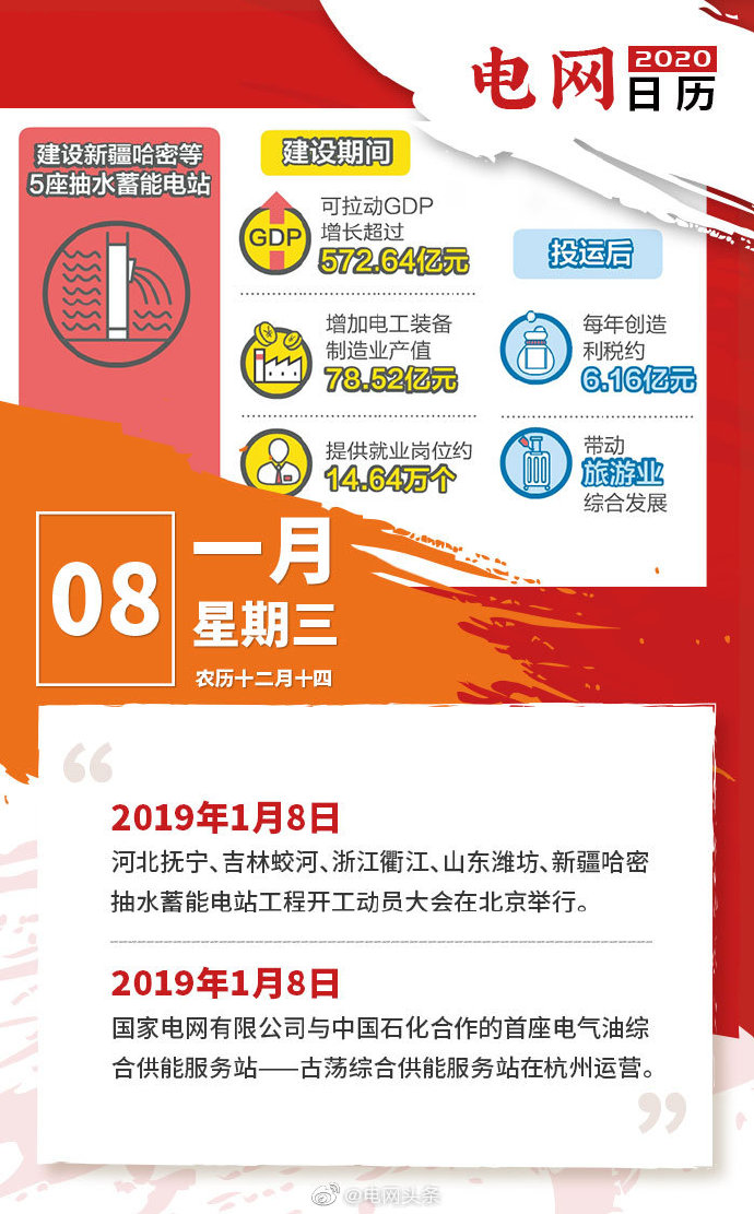 2019年1月8日,河北撫寧、吉林蛟河、浙江衢江、山東濰坊、新疆哈密抽水蓄能電站工程開工動(dòng)員大會(huì)在北京舉行。2019年1月8日,國家電網(wǎng)有限公司與中國石化合作的首座電氣油綜合供能服務(wù)站——古蕩綜合供能服務(wù)站在杭州運(yùn)營。 ????