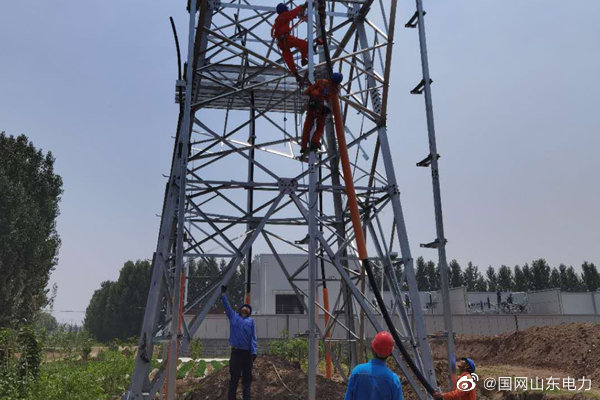 6月15日,國網(wǎng)臨沂供電公司組織近三十名線路工人高溫下進行線路施工,在臨沂新橋110千伏線路工程現(xiàn)場進行終端塔電纜安裝固定、引流線制作安裝,全力以赴為蘭山區(qū)域西部區(qū)域建設新電源,保障地方居民夏季高峰期用上放心電。 ????