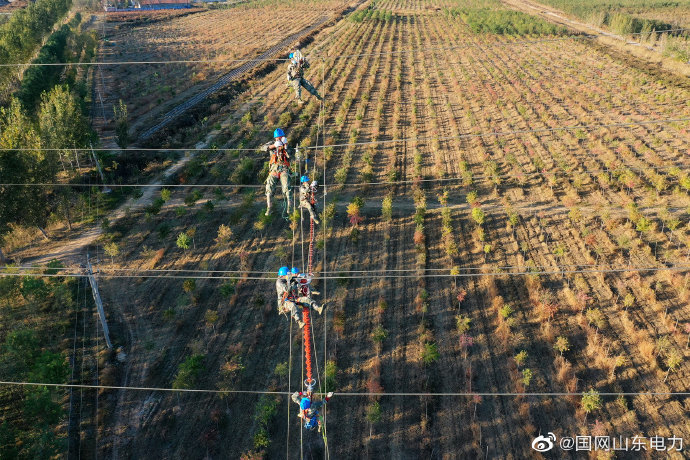【走在藍天上的空中舞者】11月10日,國網(wǎng)墾利區(qū)供電公司工作人員在110千伏坨東線30號和31號鐵塔輸電線路上安裝相間間隔棒。共在110千伏坨東線和雙勝線上安裝間隔棒44支,防止冬季寒潮大風(fēng)天氣線路舞動導(dǎo)致跳閘,空中舞者守護線路安全。 ????