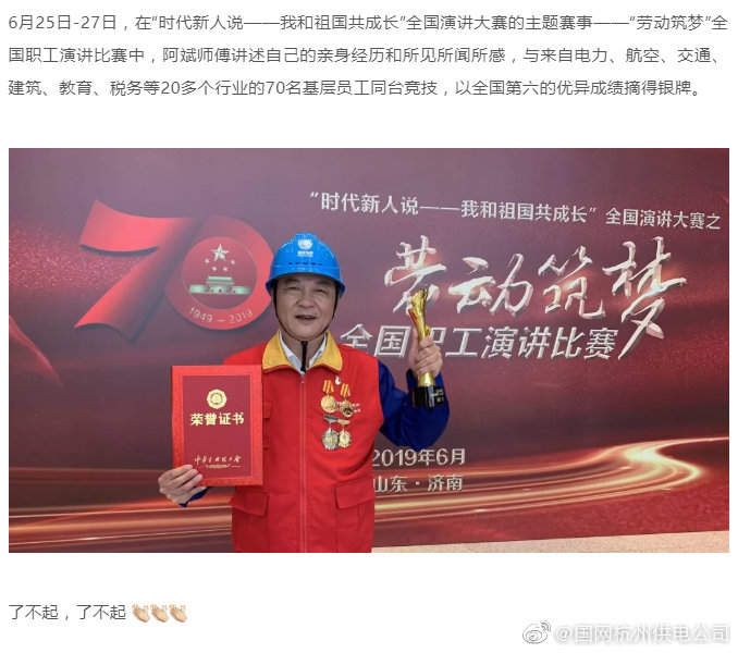 【這三個黨建“牛人”,今天要給個頭條】6月25日-27日,在“時代新人說——我和祖國共成長”全國演講大賽的主題賽事——“勞動筑夢”全國職工演講比賽中,阿斌師傅講述自己的親身經(jīng)歷和所見所聞所感,與來自電力、航空、交通、建筑、教育、稅務等20多個行業(yè)的70名基層員工同臺競技,以全國第六的優(yōu)異成績摘得銀牌。