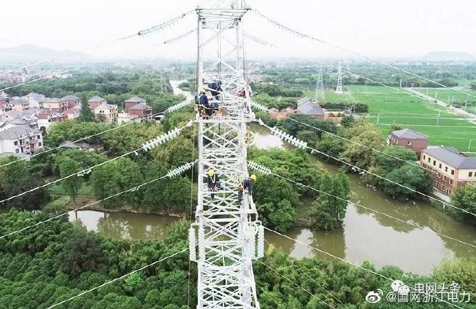 國網(wǎng)杭州市余杭區(qū)供電公司員工在瓶窯鎮(zhèn)110千伏柏廟輸變電工程施工現(xiàn)場展放導(dǎo)線..