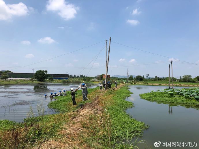 【湖中巧立桿,送去“安心電”】7月23日,國網武漢市蔡甸區(qū)供電公司侏儒供電所在10kV侏508馬賽線鐵爐支線立桿架線,電力工人們頭頂烈日,泡在水里立桿放線,只為附近居民早日用上“安心電”。