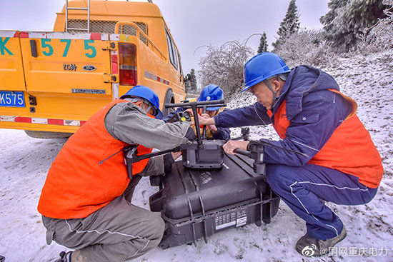【寒潮來襲 無人機助電網(wǎng)人戰(zhàn)冰雪】12月15日,涪陵電力公司輸電運檢二班的巡線工人踏上了輸電線路特巡之路,在110千伏濤中線36號桿塔,輸電檢修班將進行一次雪中無人機巡線??碧胶梦恢?,取出無人機,“機長”黃東小心地檢視機器各部位,檢查遙控器及電量情況。確定飛行路線后,無人機一陣轟鳴,悠悠地飛了起來。沿著濤中線,無人機越飛越高,越飛越遠。黃東不時地微調(diào)飛行高度和位置,使機器懸停在36號桿塔上方。“36號桿塔電桿拉線上有覆冰,需要前往現(xiàn)場處理?!秉S東注視著屏幕說道。連日來,受持續(xù)雨雪冰凍天氣影響,重慶涪陵武陵山區(qū)部分輸電線路出現(xiàn)了覆冰情況,給電網(wǎng)安全造成了較大壓力。冰雪天氣利用無人機巡檢,可以近距離查看導線覆冰厚度,金具是否出現(xiàn)磨損碰撞,實時傳回影像,影像存儲導出后還可繼續(xù)研究,為線路覆冰情況提供第一手參考資料。