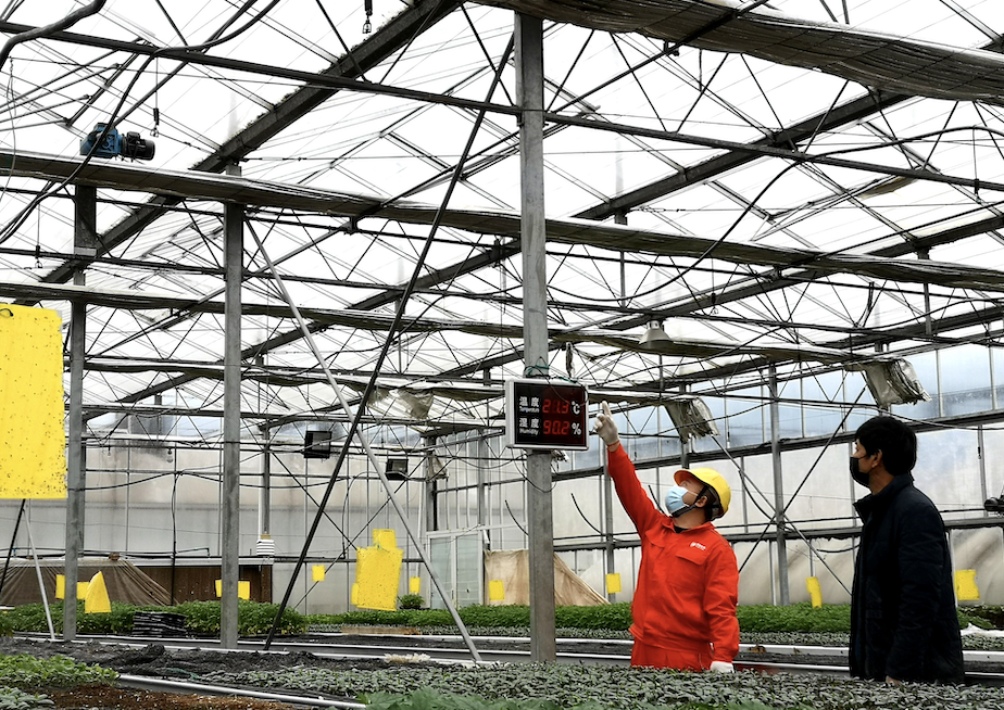 國(guó)網(wǎng)重慶電員工為育苗大棚電力線(xiàn)路進(jìn)行用電安全檢查。