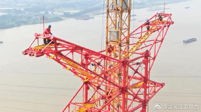 6月24日,在鎮(zhèn)江五峰山220千伏跨江升高改造工程南跨越塔舊塔爆破原址,江蘇省送變電有限公司施工人員正在162米的高空組裝新鐵塔。隨著最后一吊地線頂架完成組裝,標志著南跨越塔全部組裝完成。新建跨江輸電線路建設(shè)后將滿足現(xiàn)今長江干線5萬噸級海輪遠航凈高50米的要求,輸電能力也較原來提升3倍以上。