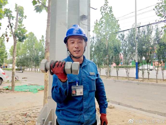 6月15日傍晚6時余,國網(wǎng)陽谷縣供電公司8名員工仍在10千伏谷山線改造現(xiàn)場緊張施工,他們按位置蹲好,用大號扳手緊固拳頭大小的螺絲帽??吹叫【帥]見過世面的樣子,熱情的王師傅詳細演示了一遍螺絲緊固過程,開玩笑道:小哥,啞鈴大的螺絲見過沒? ????